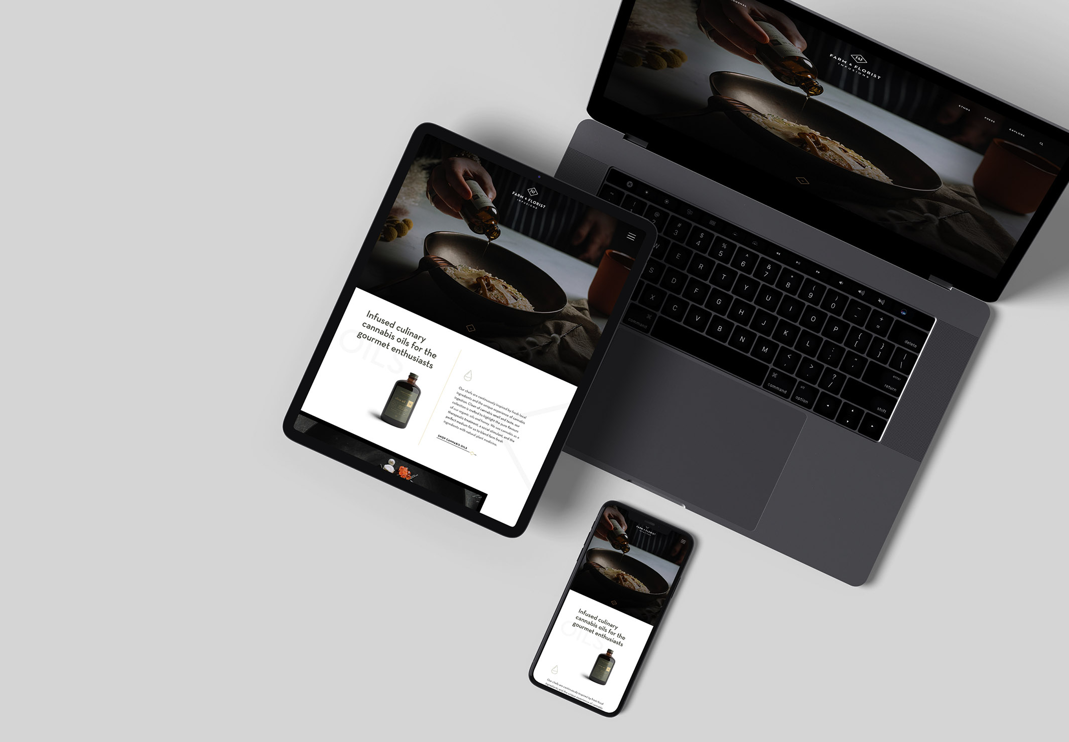 The main page showcases each category of product, from cannabis-infused oil, teas, and candy. There are a few cut out images to show the products in context and to be appetizing. The raw honey product is highlighted, as well as a section for their cookbook about cannabis dining and a quick About Us section.