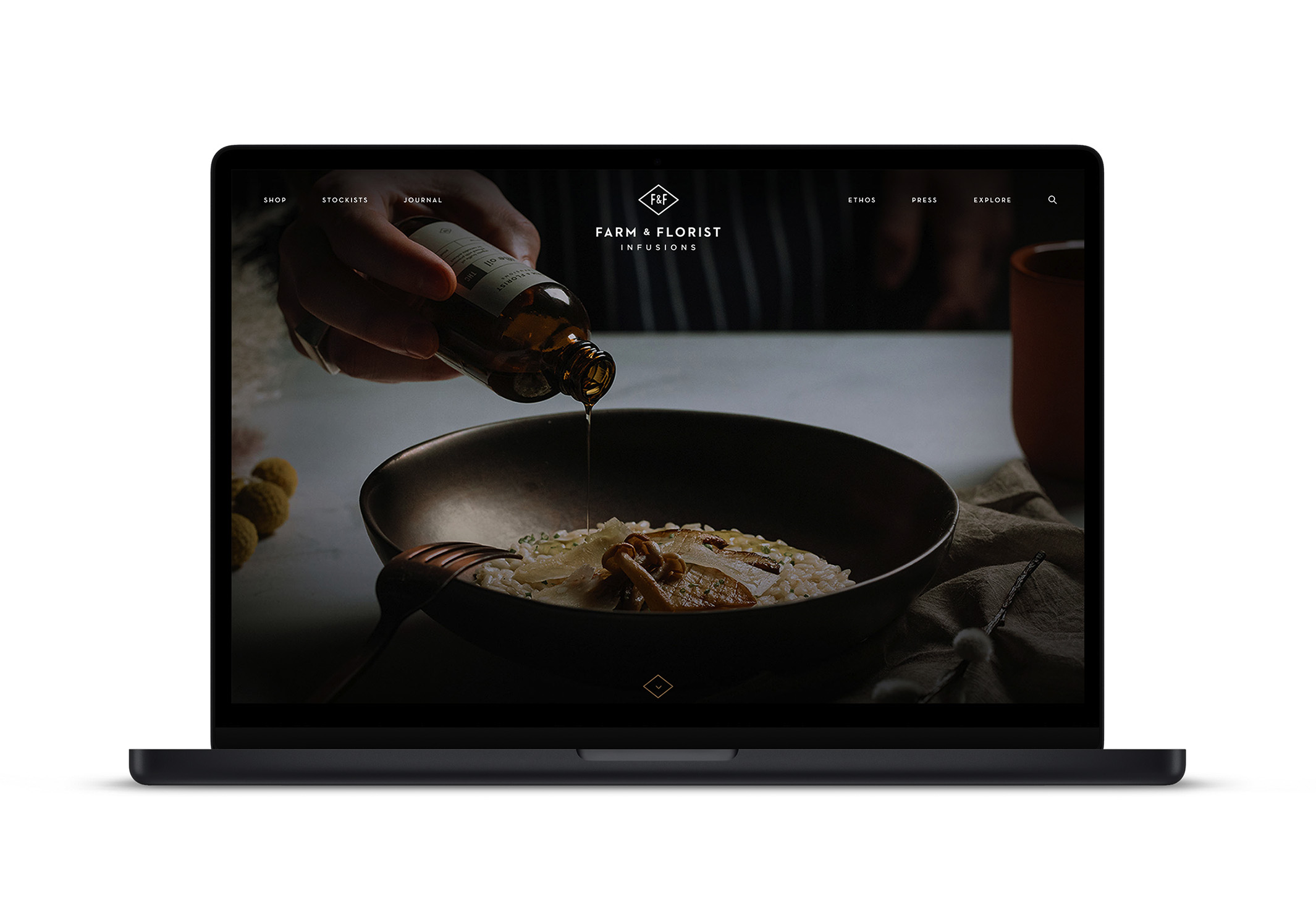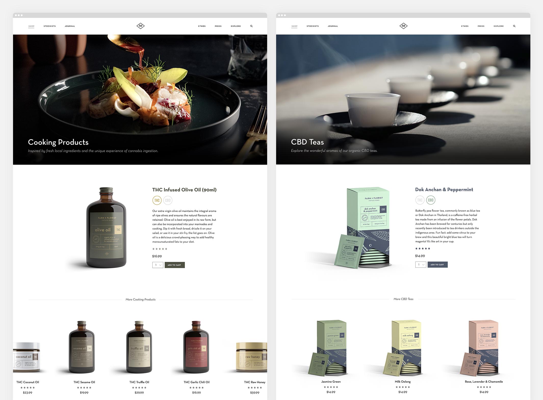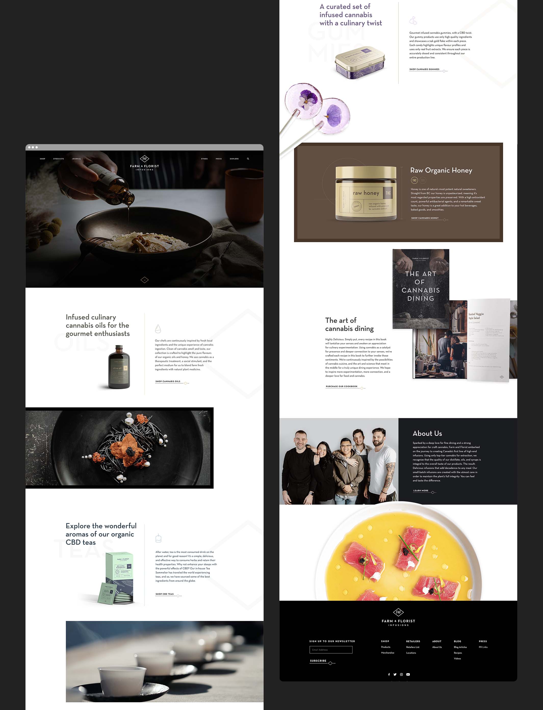 Design for the Farm & Florist website which includes the main page and product pages. Farm & Florist creates high-end cannabis infusions, from a variety of oils, honey, teas, and candy, targeted towards gourmet cooking. The mood board evokes the general theme and vibe of the design.